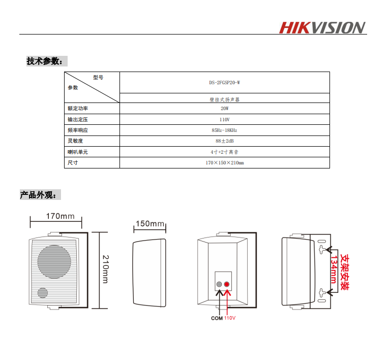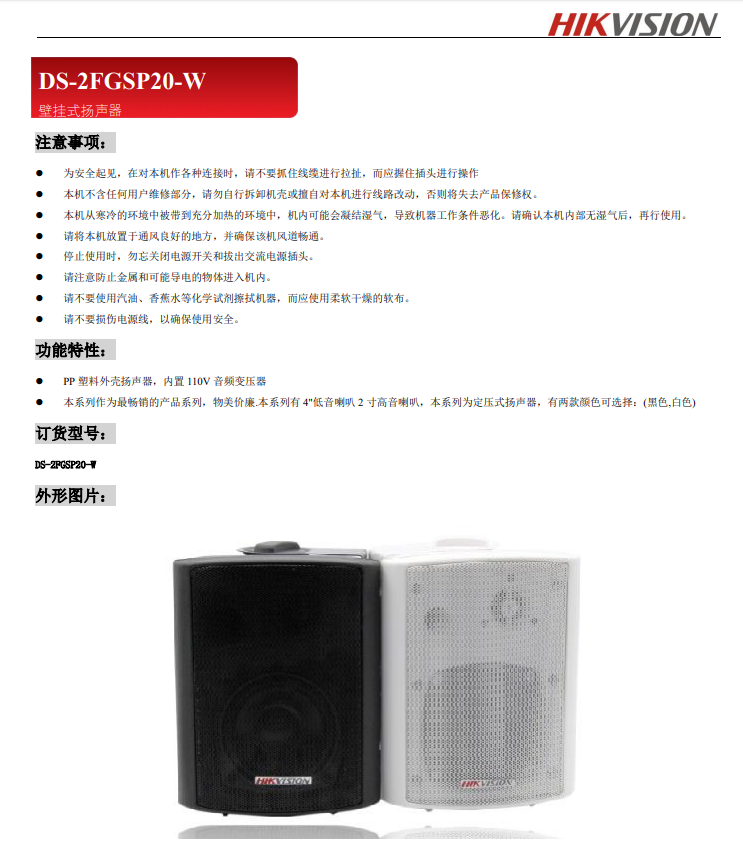 壁挂式扬声器额定功率:20W有效传播距离:10-20米灵敏度:88±2dB频率响应:85HZ-16kHZ喇叭单元:4寸+2寸高音材质:PP塑料材质重量(净重):2020g设备尺寸:170*150*210mm